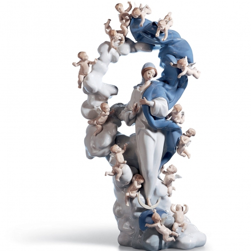 Figura di porcellana splendente della Vergine Immacolata avvolta da drappi blu e bianchi circondati da angeli. Altezza: 54 cm; Lunghezza: 26 cm; Profondita: 20 cm