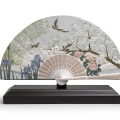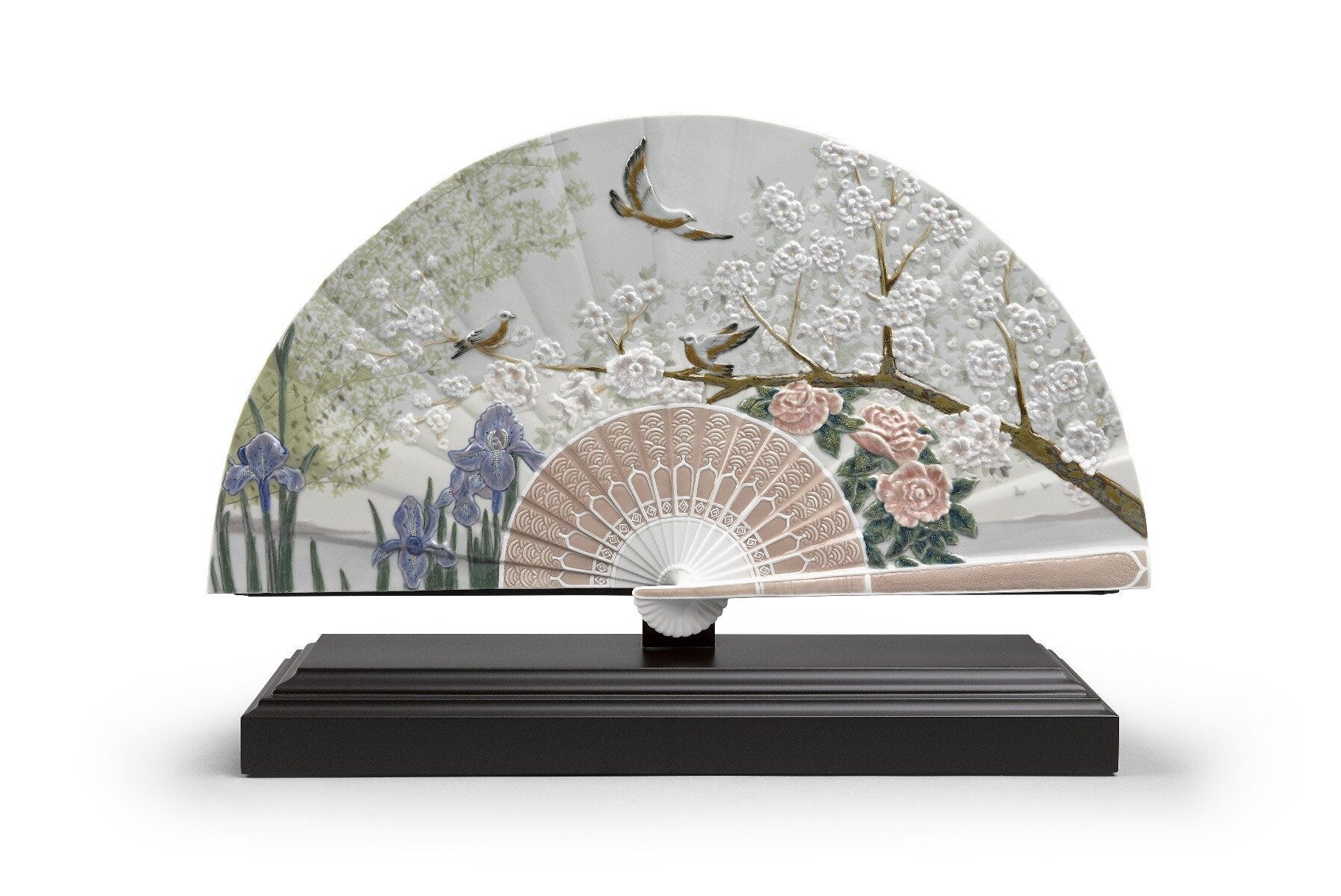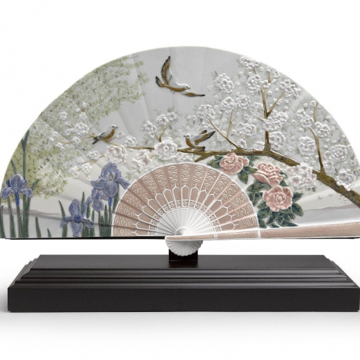 Ventaglio con gigli e ciliegi decorati con colori tenui e smalti con due ganci nella parte posteriore che permette di appenderlo alla parete per la decorazione domestica. Altezza: 35 cm; Lunghezza: 52 cm; Profondita: 14 cm