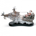 Figura in porcellana lucida di serie limitata di Babbo Natale con slitta piena di regali trainati da tre renne. Altezza: 36 cm; Lunghezza: 65 cm; Profondita: 24 cm