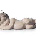Figura in porcellana lucida di Gesù Bambino sdraiato con la testa appoggiata sulle sue braccia e con corona d'oro. Altezza: 3 cm; Lunghezza: 9 cm; Profondita: 3 cm