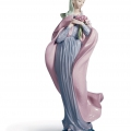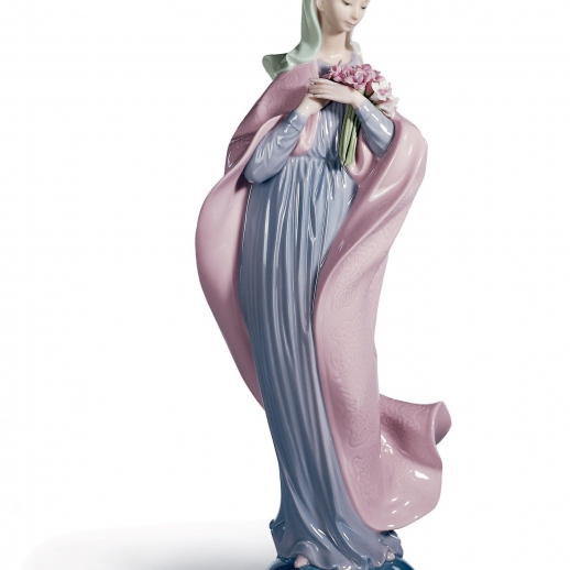 Figura di porcellana scintillio della Vergine con tunica blu e rosa che porta un mazzo di fiori. Altezza: 32 cm; Lunghezza: 11 cm; Profondita: 14 cm