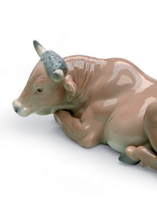Figura in porcellana lucida di bue sdraiato. Altezza: 7 cm; Lunghezza: 22 cm; Profondita: 10 cm