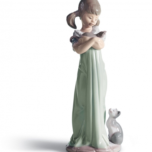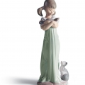 Figura in porcellana scintillio ragazza con due treccine e le sue due gattini, uno in braccio e uno accanto ai suoi piedi. Altezza: 21 cm; Lunghezza: 7 cm; Profondita: 8 cm