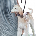 Figura di porcellana scintillio di una donna con pamela e abito blu e rosa a piedi i suoi due cani. Altezza: 39 cm; Lunghezza: 23 cm; Profondita: 21 cm