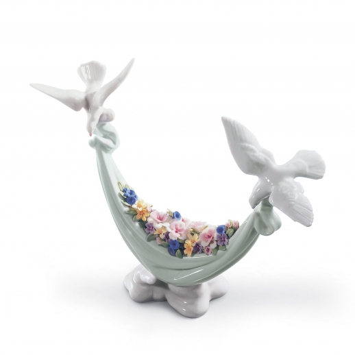 Figura in porcellana lucente di due piccioni che reggono un panno bianco pieno di fiori fatti a mano. Altezza: 22 cm; Lunghezza: 22 cm; Profondita: 10 cm
