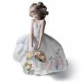 Figura di ragazza in porcellana con un cesto di fiori selvatici e un abito bianco decorato con morbidi ornamenti floreali. Altezza: 26 cm; Lunghezza: 21 cm; Profondita: 18 cm