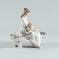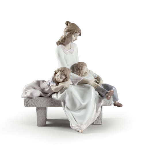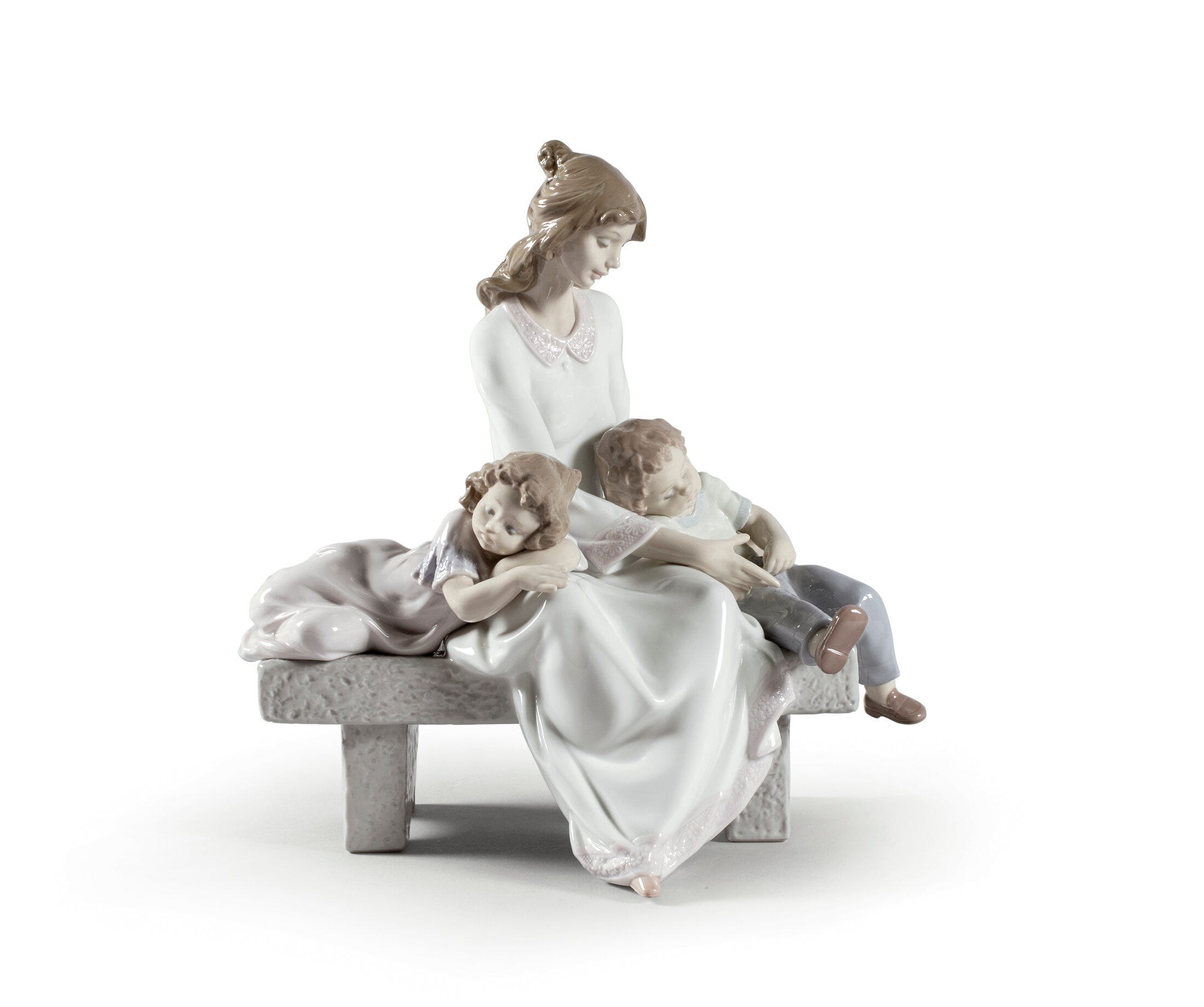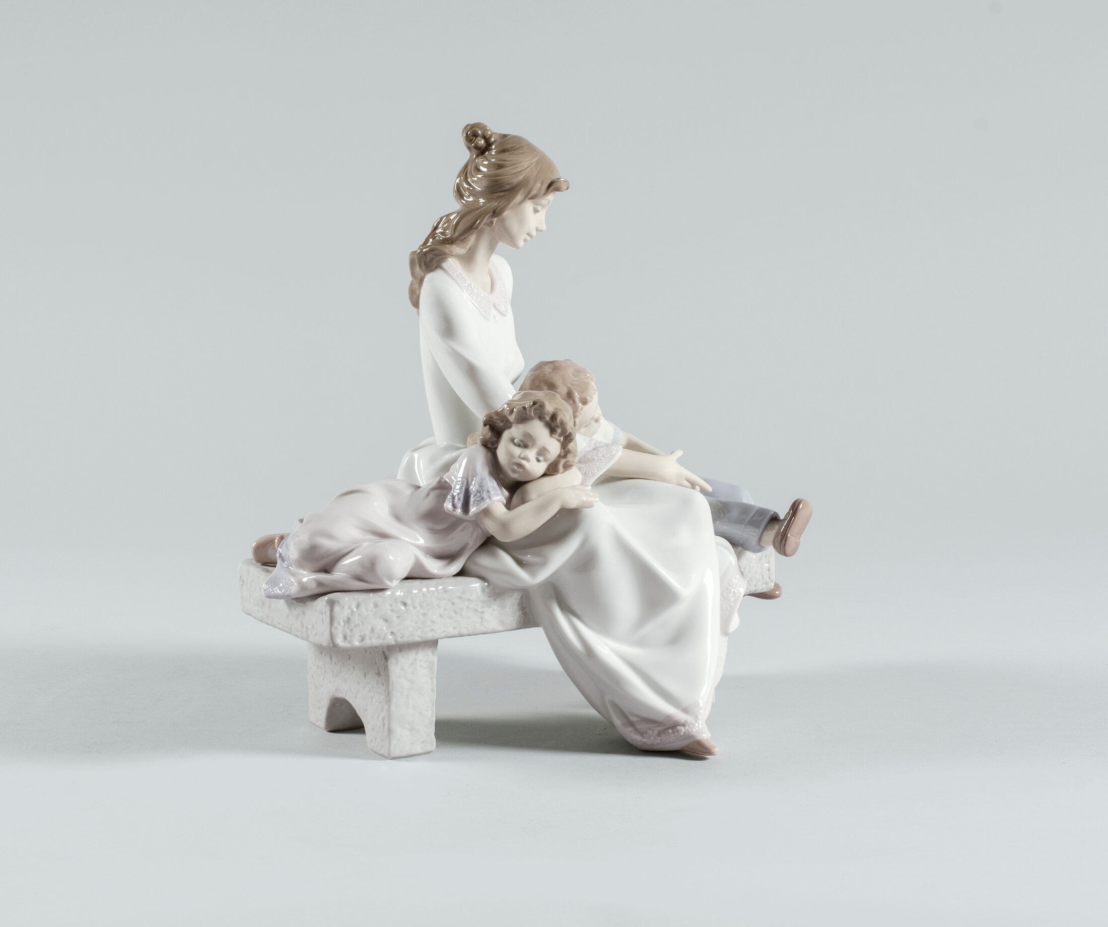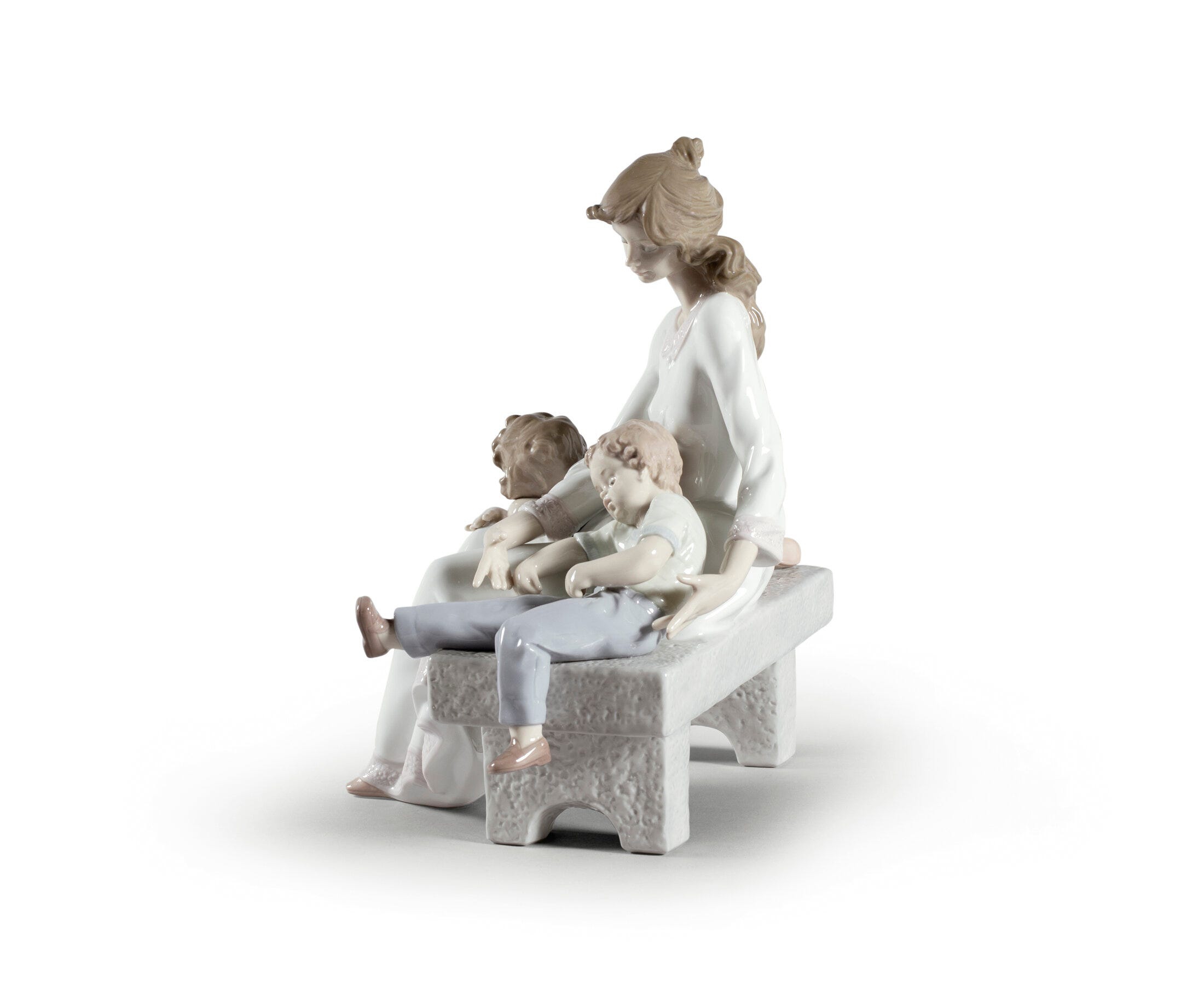 Figura di porcellana luccicante di una madre con un lungo abito bianco e rosa con i suoi due bambini seduti su una panchina stanca dopo aver giocato. Altezza: 29 cm; Lunghezza: 30 cm; Profondita: 21 cm