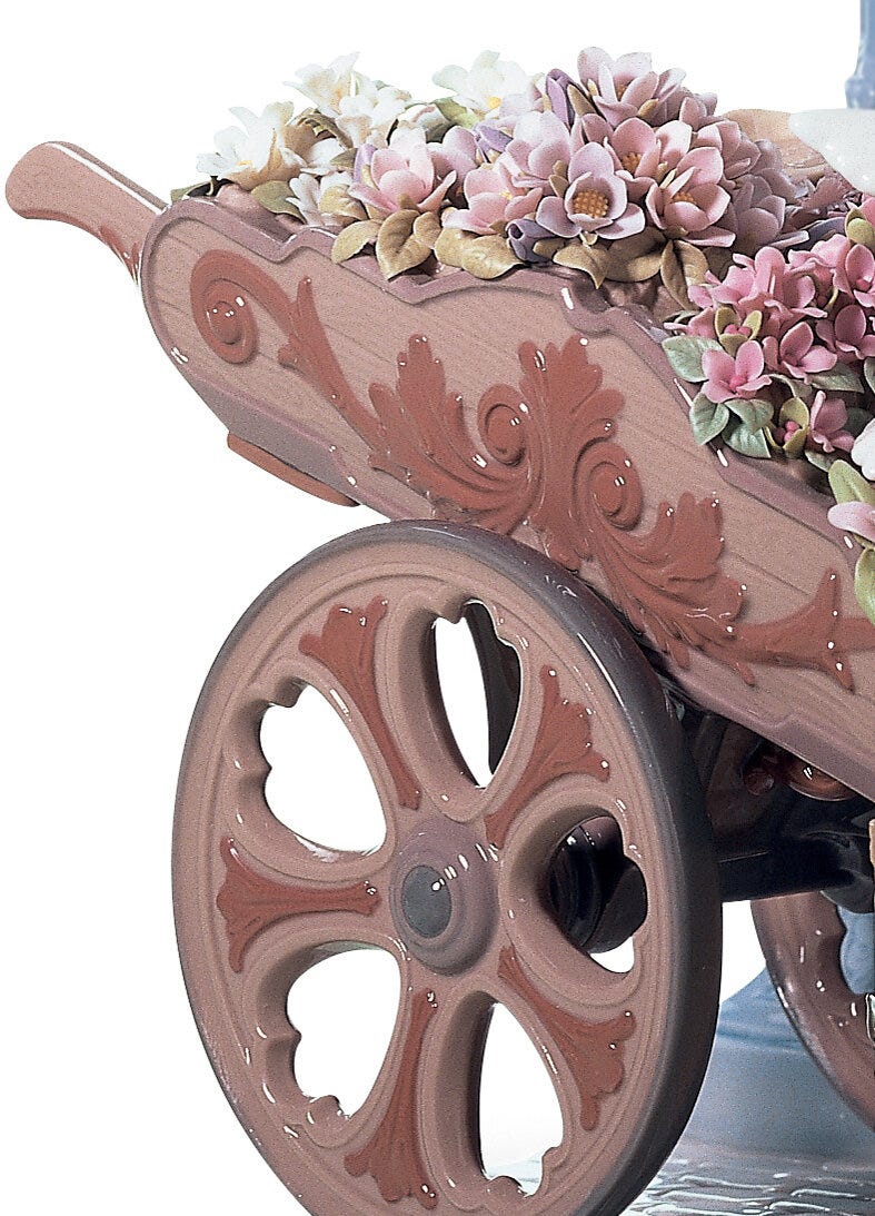 Scultura di donna in porcellana lucente con ombrello in tulle e pizzo con carriola e vasi pieni di fiori che osservano una colomba appollaiata su di loro. Altezza: 38 cm; Lunghezza: 26 cm; Profondita: 22 cm