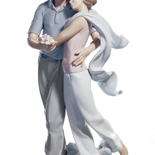 La figura della coppia scalza a piedi nudi splendente di porcellana, lui con un ciuffo di fiori bianchi e lei con un fazzoletto con le pieghe bianche al vento. Altezza: 36 cm; Lunghezza: 16 cm; Profondita: 16 cm