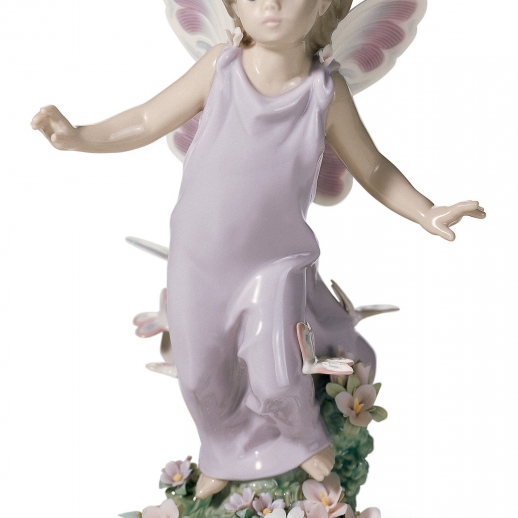 Figura ragazza glitter porcellana con ali di farfalla a piedi attraverso la foresta piena di fiori e farfalle. Altezza: 23 cm; Lunghezza: 15 cm; Profondita: 12 cm