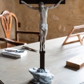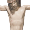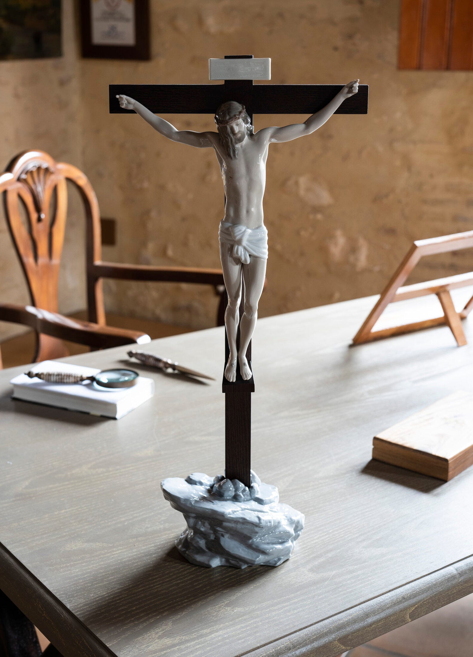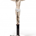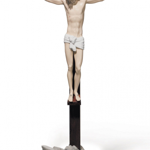 Figura di porcellana luccicante del nostro salvatore sulla croce di legno con una frase incisa sopra. Altezza: 60 cm; Lunghezza: 28 cm; Profondita: 14 cm