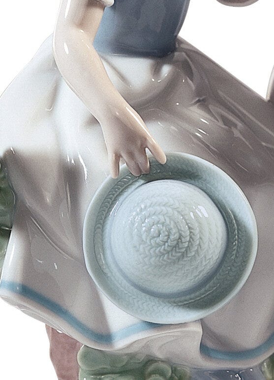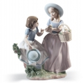Figura di porcellana scintillio di due ragazze con cappello guardando un cesto di fiori con fiori che indossa uno di loro. Altezza: 25 cm; Lunghezza: 20 cm; Profondita: 12 cm