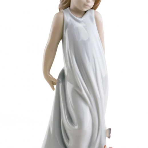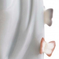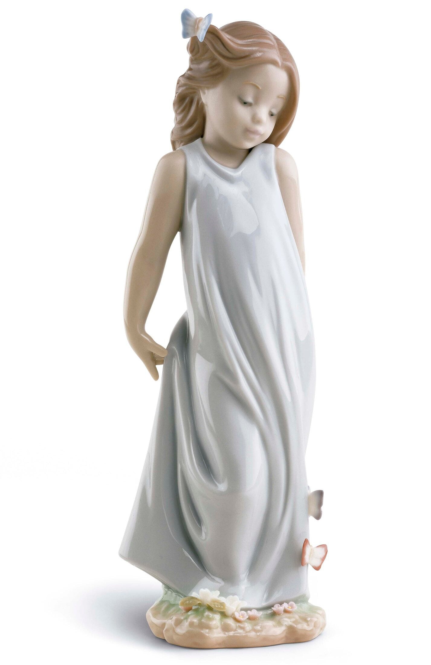 Figura in porcellana scintillio ragazza con lungo abito blu e farfalle arroccate su di esso e fiori sul pavimento. Altezza: 21 cm; Lunghezza: 8 cm; Profondita: 7 cm