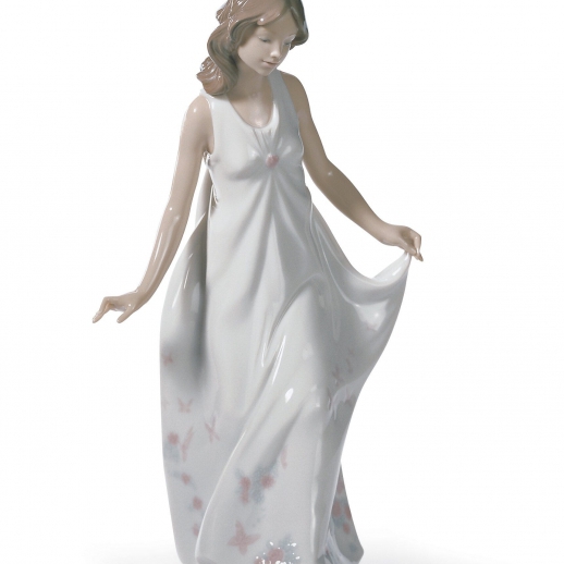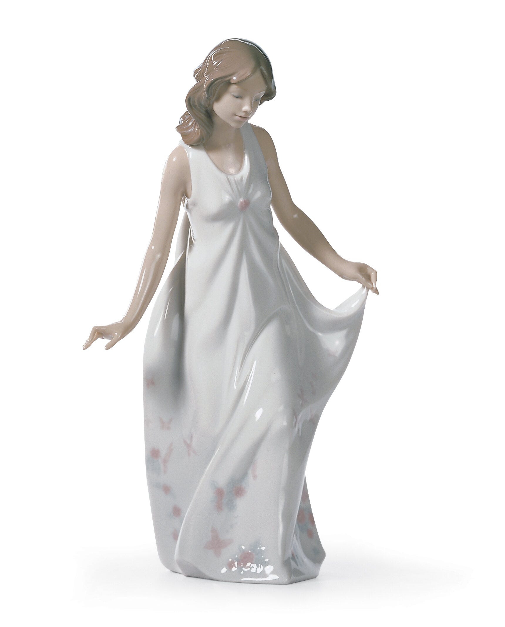 Figura in porcellana lucida di donna in abito lungo di colore bianco con motivi floreali dai colori tenui. Altezza: 28 cm; Lunghezza: 16 cm; Profondita: 13 cm