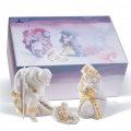 Figure in porcellana lucida della Vergine Maria, Gesù bambino e San Giuseppe di colore bianco e oro lucido e satinato. Altezza: 22 cm; Lunghezza: 44 cm; Profondita: 16 cm
