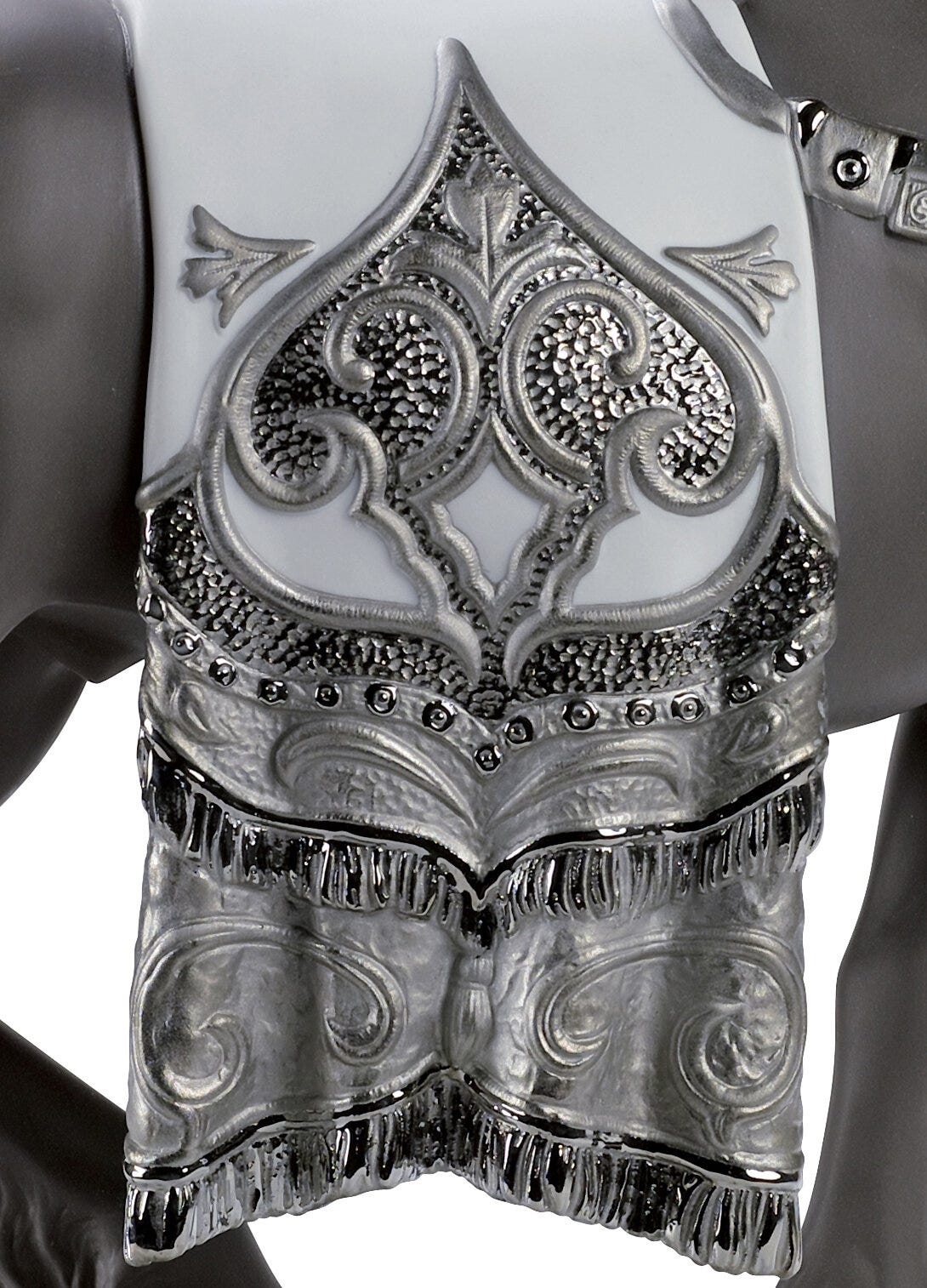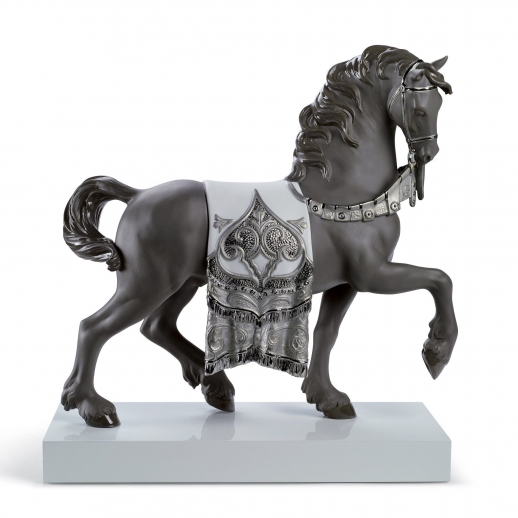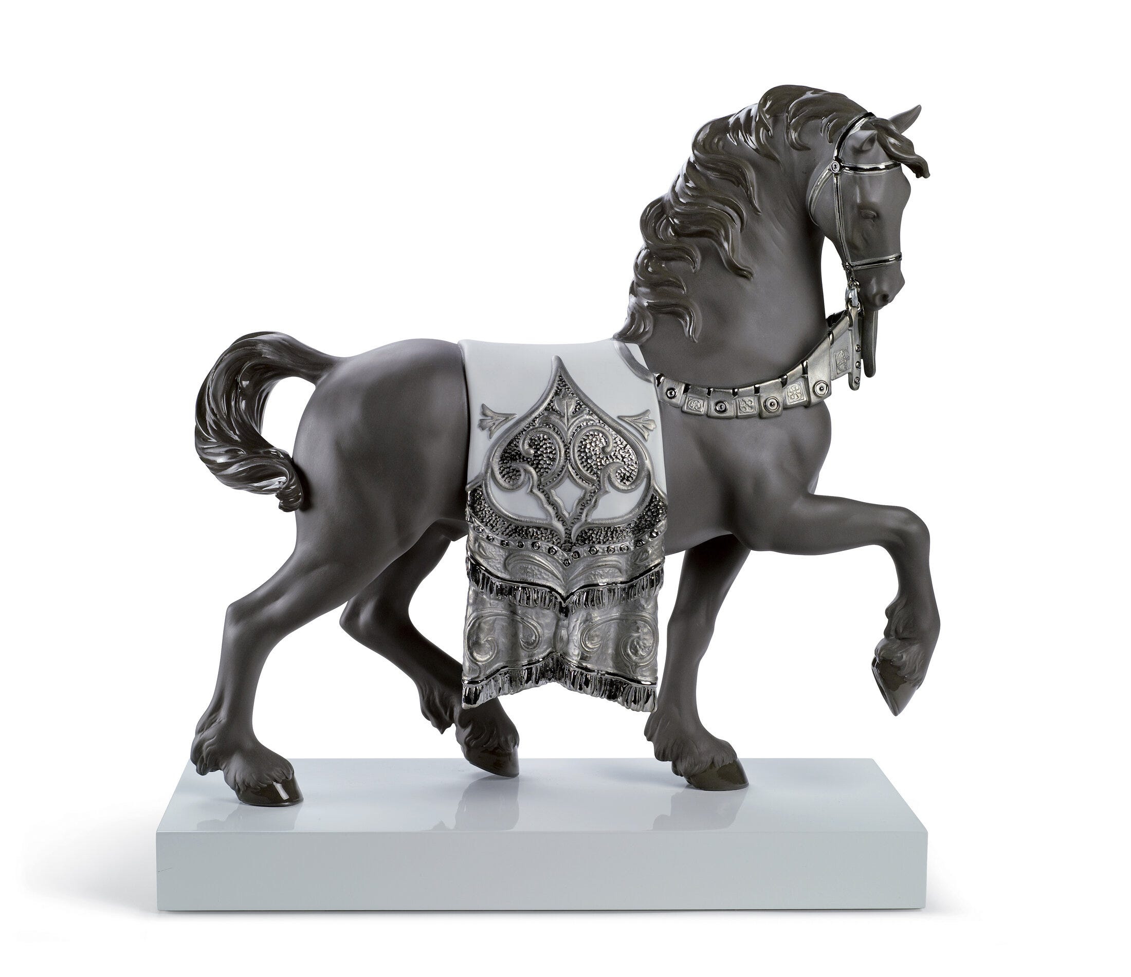 Scultura cavallo cortigiano in porcellana nera lucida e opaca con arabeschi in smalto argentato che decorano l'imbracatura e la coperta. Altezza: 42 cm; Lunghezza: 40 cm; Profondita: 16 cm