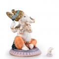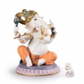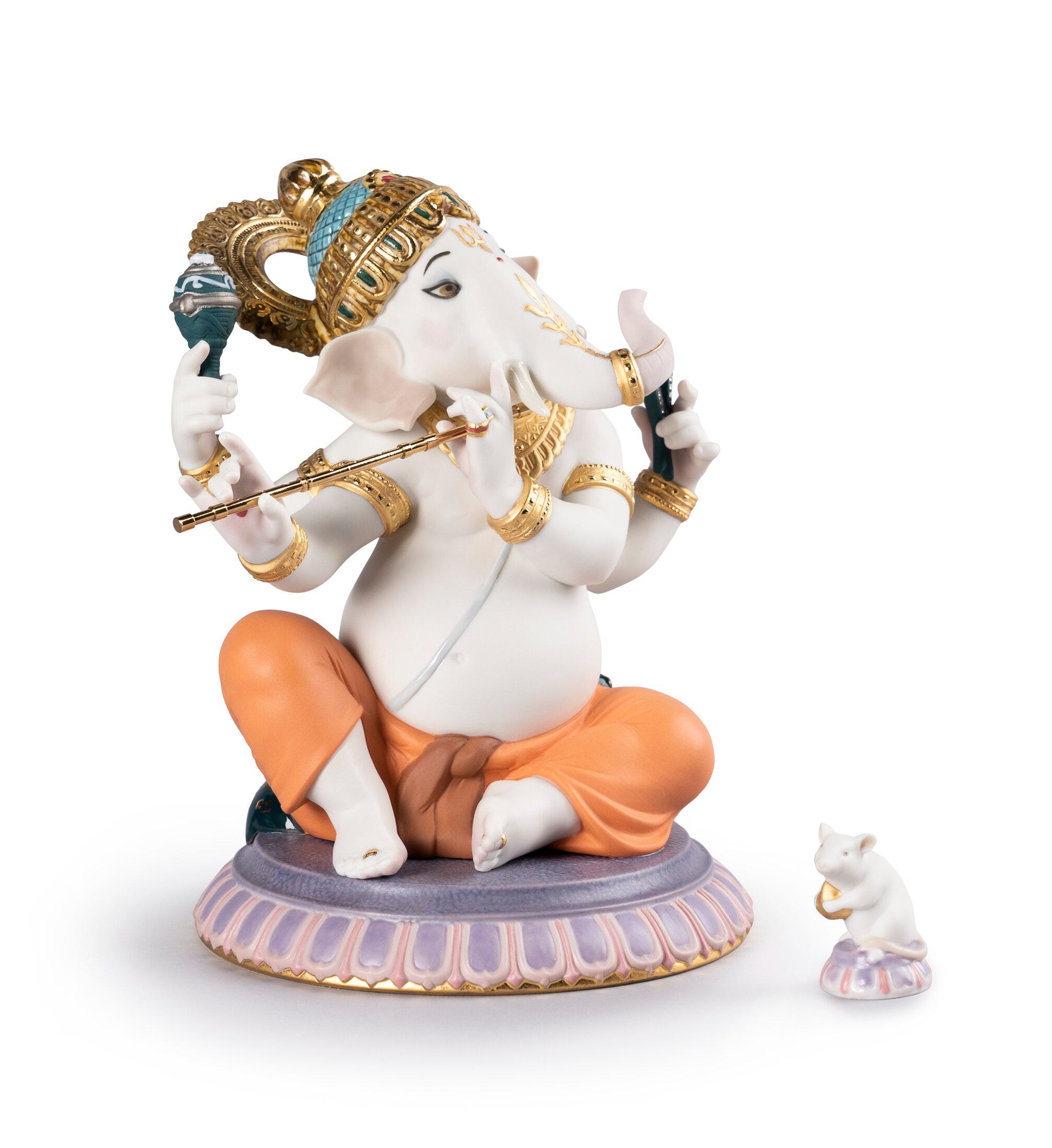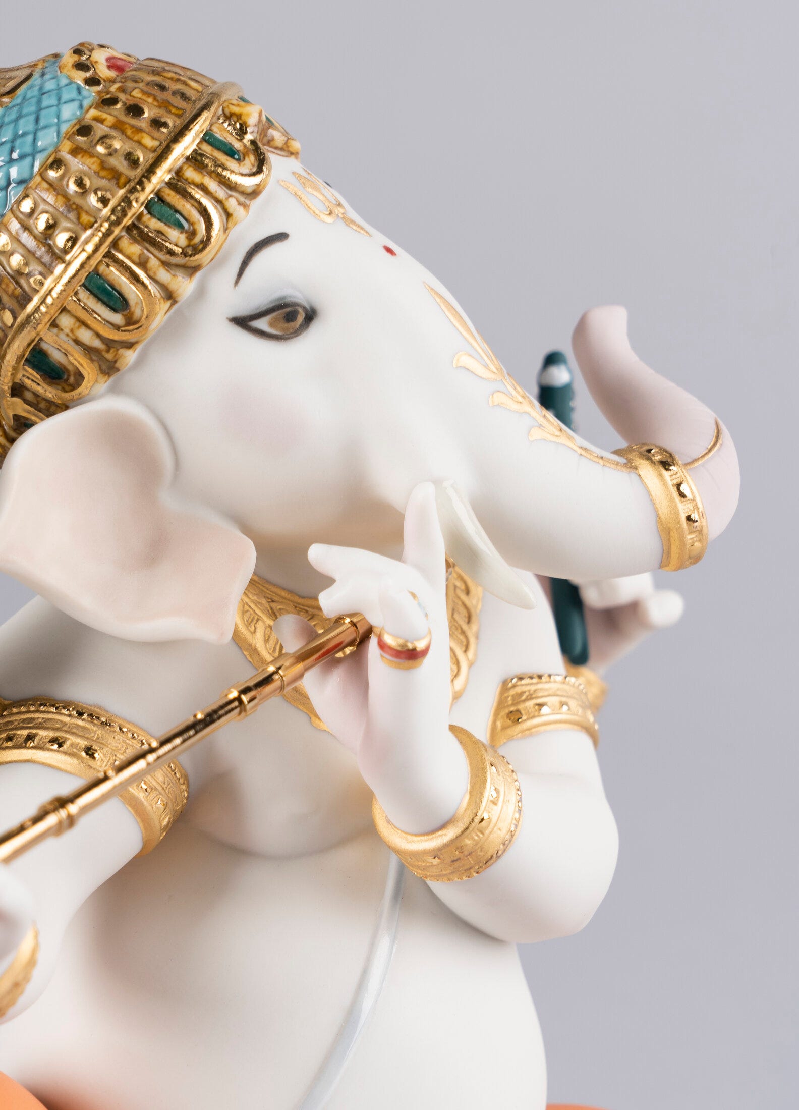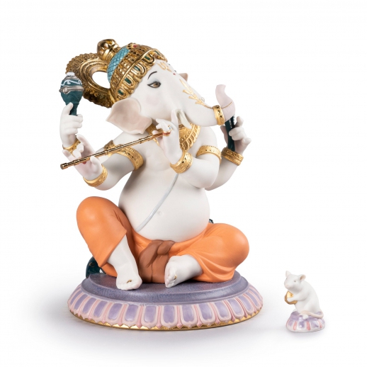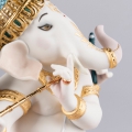 Figura del dio indù Lord Ganesha con corpo umano e testa elefante in porcellana mentre suona il flauto indù (bansuri). Serie limitata. Altezza: 23 cm; Lunghezza: 19 cm; Profondita: 15 cm
