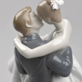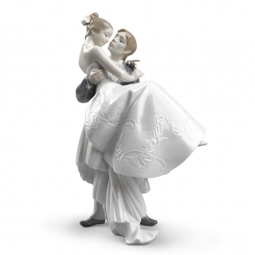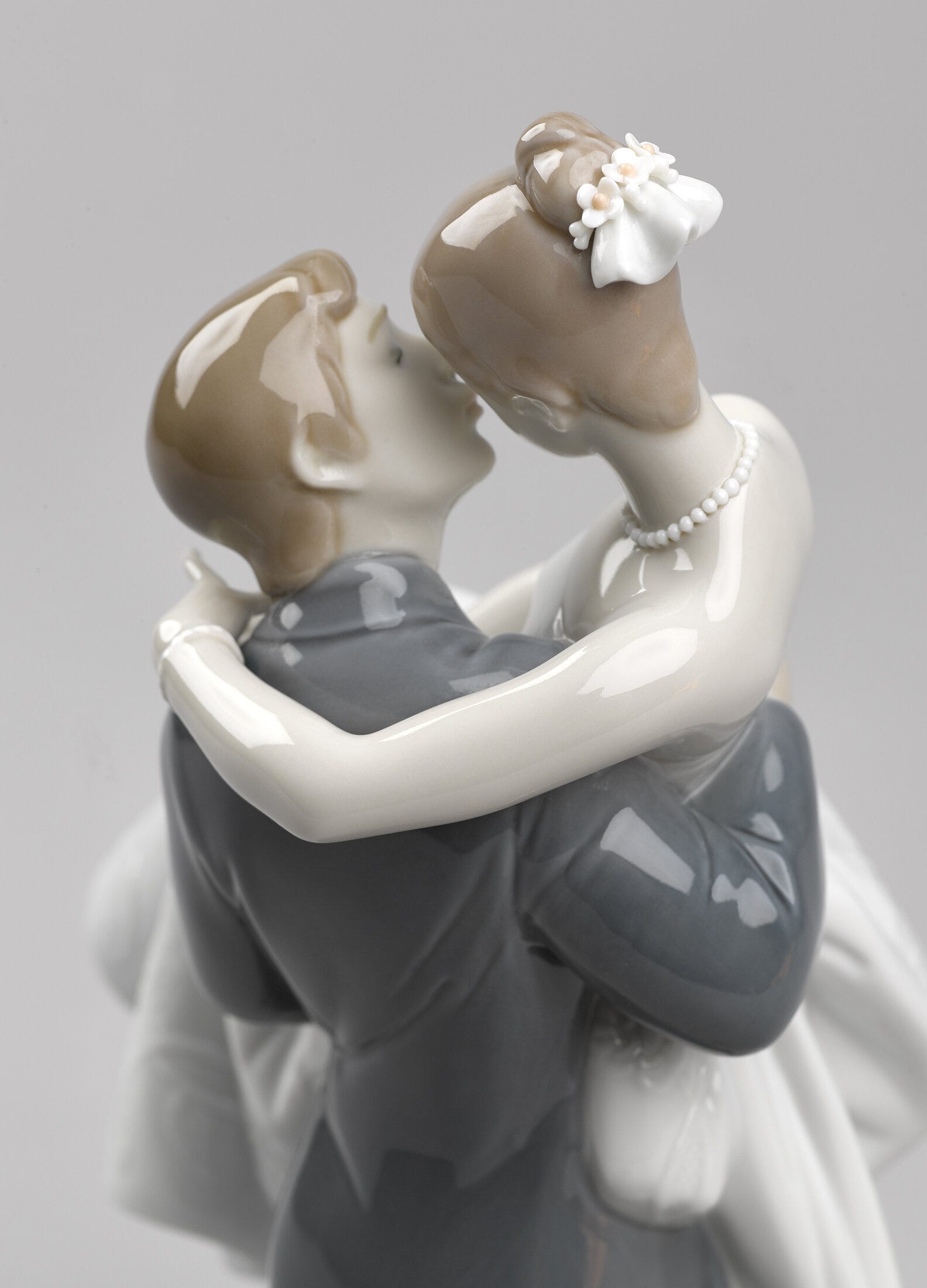 Figura coppia di sposi in porcellana glitterata, si alza in braccio allo sposo con abito bianco con motivi floreali, collana di perle e delicato copricapo. Altezza: 27 cm; Lunghezza: 17 cm; Profondita: 14 cm