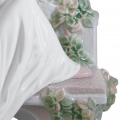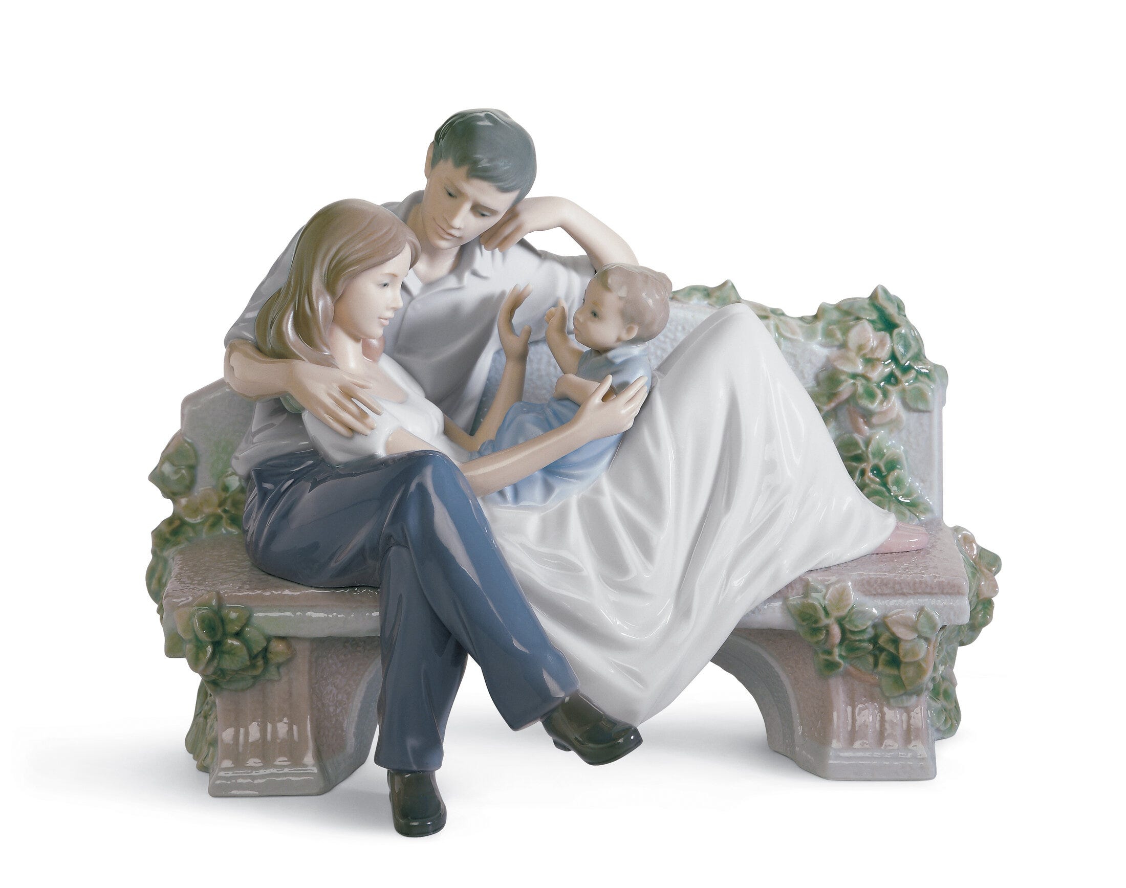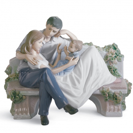 Figura di porcellana luccicante di una coppia su una panchina, lei sdraiata su di esso a giocare con il suo piccolo figlio. Altezza: 19 cm; Lunghezza: 23 cm; Profondita: 17 cm