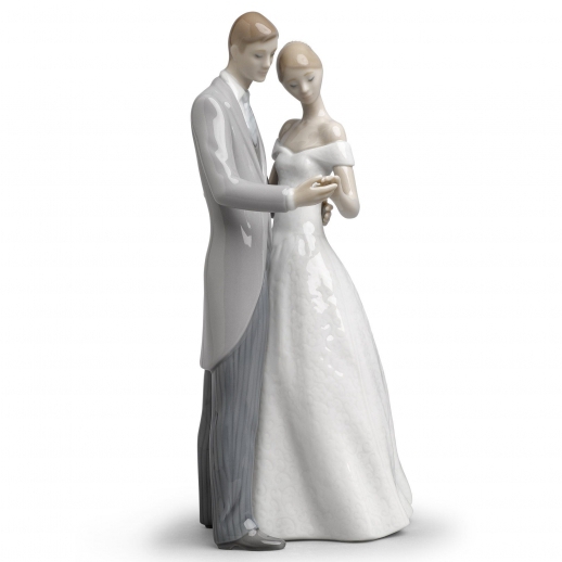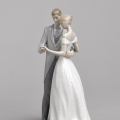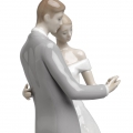 Figura coppia di sposi glitter porcellana, lei con abito bianco di spalle in aria con incisioni floreali e lui con cappotto del mattino. Altezza: 21 cm; Lunghezza: 10 cm; Profondita: 9 cm
