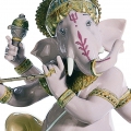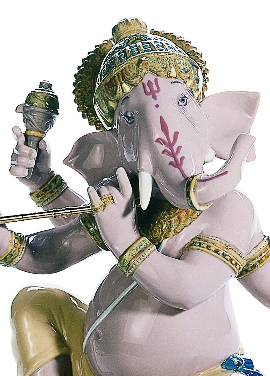 Figura del dio indù Lord Ganesha con corpo umano e testa di elefante in porcellana mentre suona il flauto indù (bansuri). Altezza: 23 cm; Lunghezza: 19 cm; Profondita: 15 cm