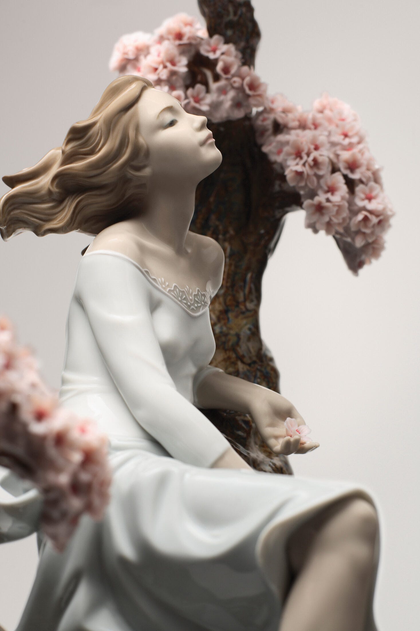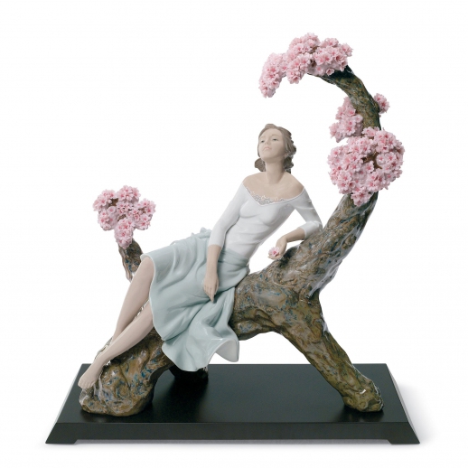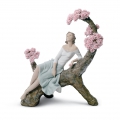 Figura in porcellana lucida di donna il cui abito, dall'ampia scollatura, è arricchito con piccoli dettagli in tulle. La donna siede sul tronco di un albero decorato con toni marroni e arricchito da fiori rosa. Altezza: 42 cm; Lunghezza: 39 cm; Profondita: 19 cm
