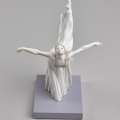 Figura di porcellana luccicante di una ballerina che pratica una posa elegante con gonna lunga a pieghe di colore bianco su base di legno di colore blu. Altezza: 28 cm; Lunghezza: 18 cm; Profondita: 21 cm