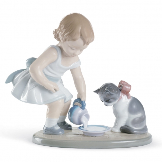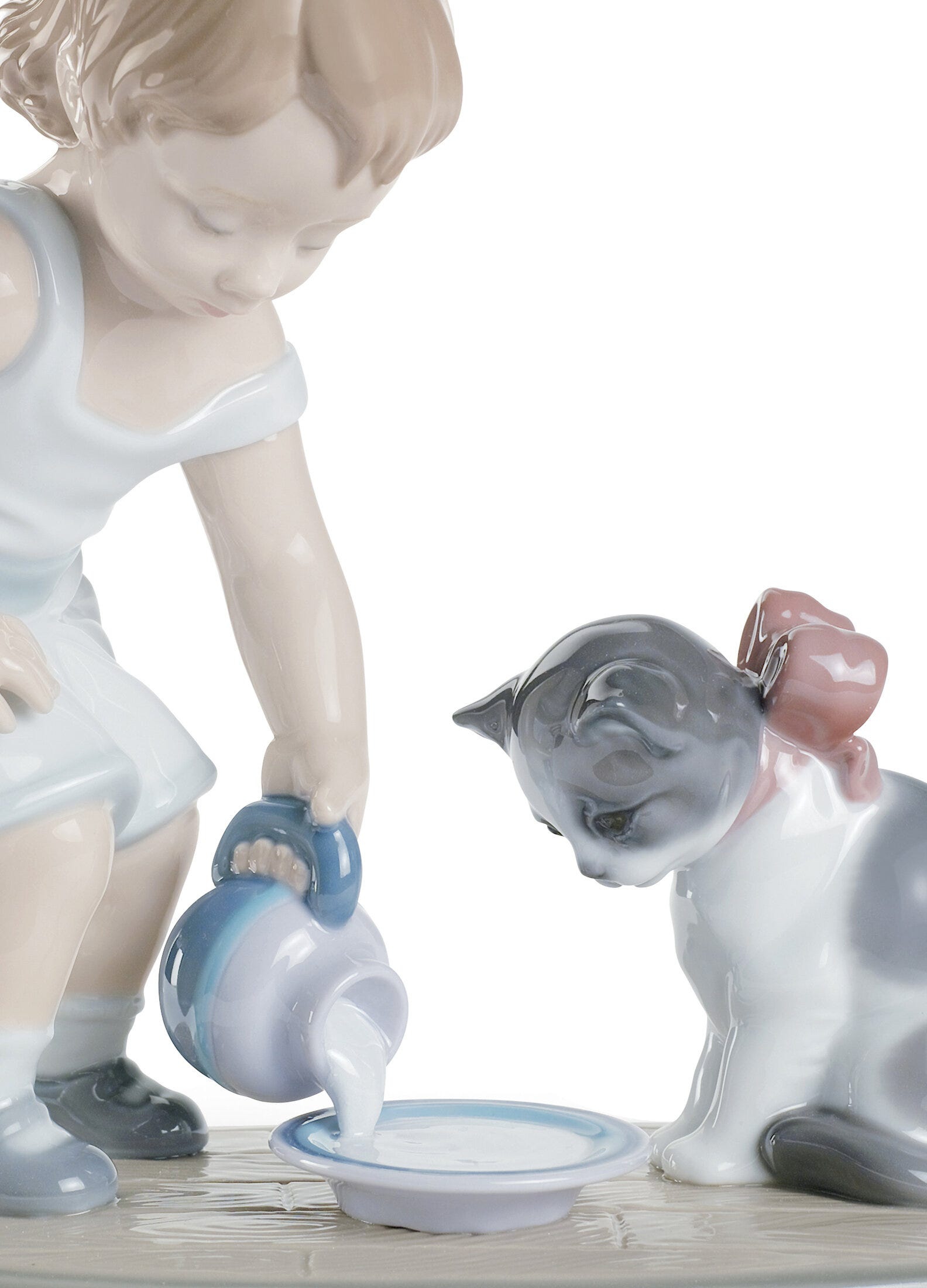 Figura brillante ragazza di porcellana che serve latte al suo gattino che indossa un fiocco rosso e un pantalone bianco con pois rossi. Altezza: 17 cm; Lunghezza: 20 cm; Profondita: 11 cm