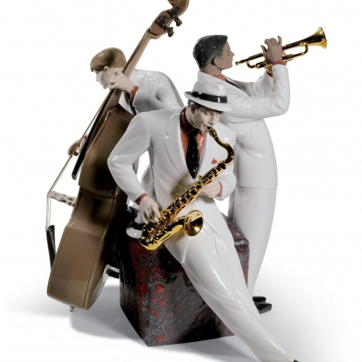 Figura di porcellana scintillante di tre musicisti con i loro strumenti appoggiati su un cubo di smalti rossi con il sassofono e la tromba di lucentezza dorata. Altezza: 35 cm; Lunghezza: 30 cm; Profondita: 35 cm