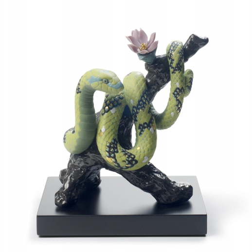 Scultura in porcellana di serpente color verde brillante che appartiene alla collezione dello zodiaco cinese. Altezza: 19 cm; Lunghezza: 18 cm; Profondita: 14 cm