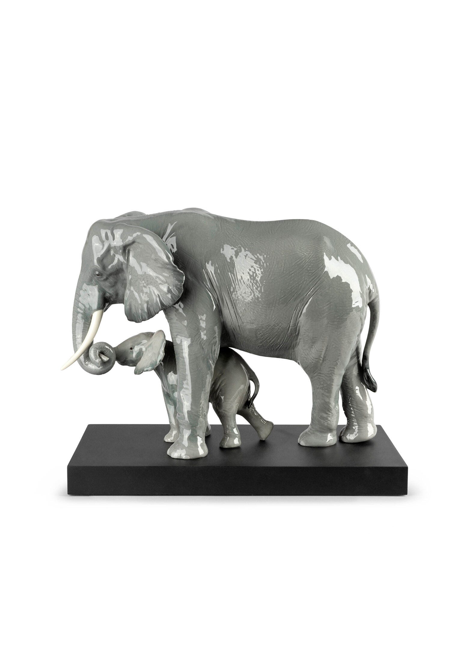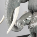Scultura di elefante che cammina con il suo bambino unito al tronco di porcellana grigio glitterato. Altezza: 29 cm; Lunghezza: 36 cm; Profondita: 19 cm