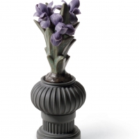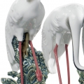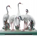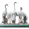 Scultura animale in porcellana lucida di cinque gru a testa rossa di serie limitata attaccate ad una base verde. Altezza: 45 cm; Lunghezza: 22 cm; Profondita: 53 cm
