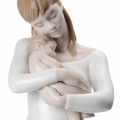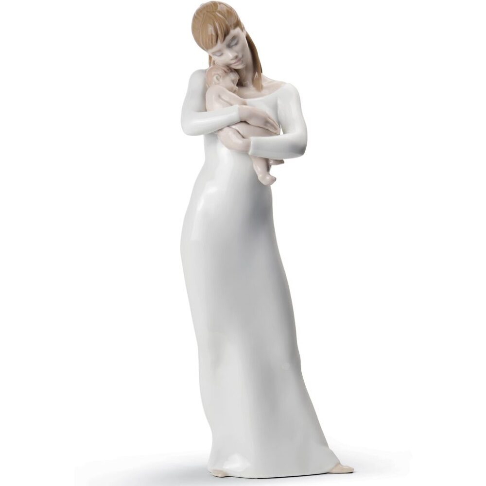 Figura di porcellana luccicante di una madre con una lunga camicia da notte bianca che fa un tenero gesto di affetto al suo bambino tra le sue braccia. Altezza: 35 cm; Lunghezza: 9 cm; Profondita: 11 cm