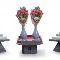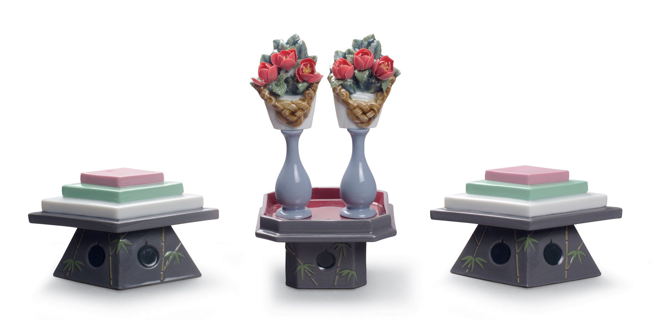 Figure da tavolo con dolci e fiori in porcellana di porcellana glitterata della tradizione giapponese come accessori per le bambole Hina. Altezza: 16 cm; Lunghezza: 20 cm; Profondita: 8 cm