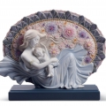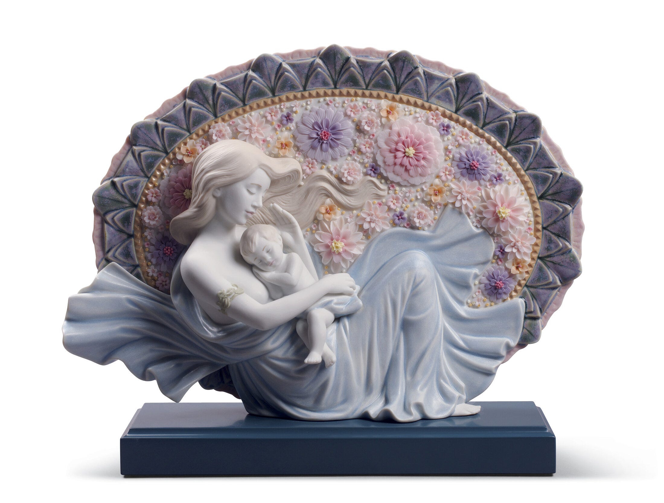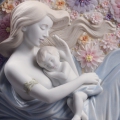 Figura di madre in porcellana opaca con il figlio in braccio decorato in toni pastello come rose, blu e viola, l'ovale sullo sfondo è ricoperto di fiori. Altezza: 28 cm; Lunghezza: 35 cm; Profondita: 11 cm