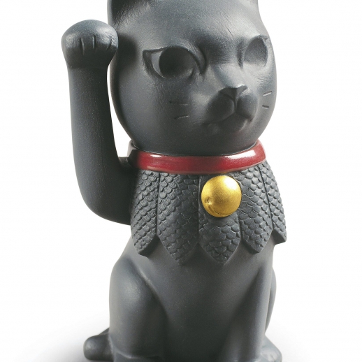 "Figura gatto della cultura giapponese di porcellana nera con collana in lustro rosso e dorato, interpretazione del Maneki Neko che significa ""colui che invita a passare"" o ""colui che saluta"". Colui che saluta con la gamba destra porta prosperità... Altezza: 11 cm; Lunghezza: 6 cm; Profondita: 6 cm