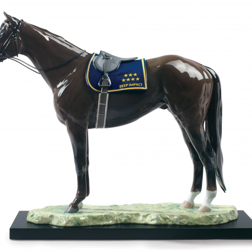 Scultura di porcellana glitter marrone cavallo e sella con coperta di blu e giallo con base inclusa. Altezza: 46 cm; Lunghezza: 57 cm; Profondita: 18 cm