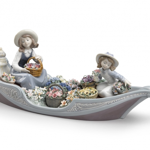 Scultura in porcellana lucida di due ragazze con cappelli arrampicata su una piccola barca piena di cesti con fiori. Altezza: 19 cm; Lunghezza: 45 cm; Profondita: 15 cm
