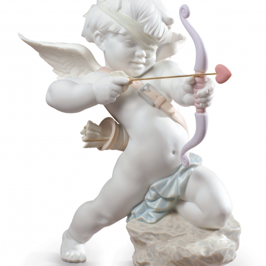Figura angelo in porcellana bianca opaca con colori tenui con arco e frecce a forma di cuore. Altezza: 26 cm; Lunghezza: 24 cm; Profondita: 17 cm