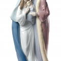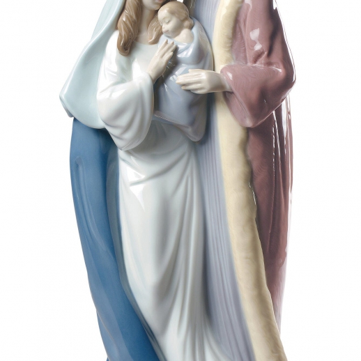 Figura di porcellana scintillio di San Jose, la vergine e il bambino con tuniche di colore blu e rosso. Altezza: 33 cm; Lunghezza: 15 cm; Profondita: 10 cm