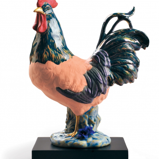 Figura in porcellana gallo opaco abbinata a diversi smalti e lucentezza dorata in becco e zampe che appartiene alla collezione dello zodiaco cinese. Altezza: 22 cm; Lunghezza: 15 cm; Profondita: 11 cm