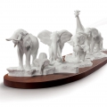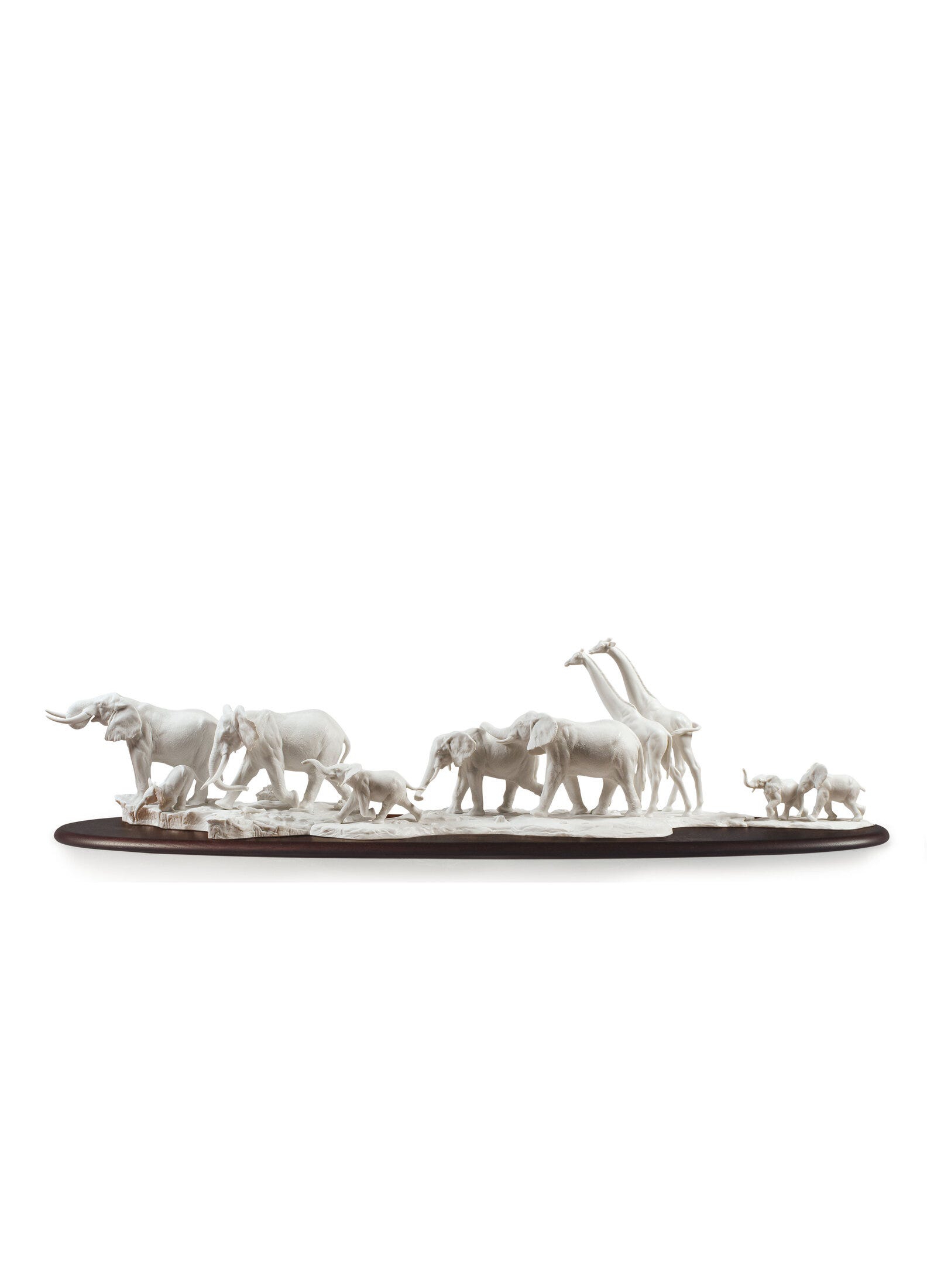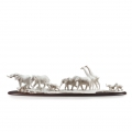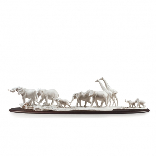 Scultura animale della porcellana opaca bianca della savana africana, elefante adulto femminile che guida il suo gruppo attraverso un percorso lungo con il piedistallo di legno dell'iroko. Altezza: 29 cm; Lunghezza: 120 cm; Profondita: 28 cm