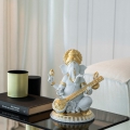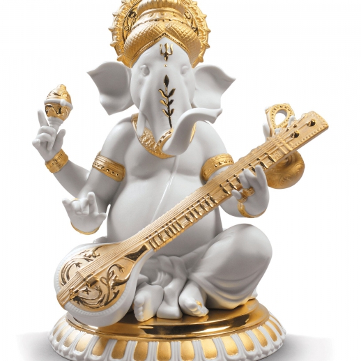 Figura in porcellana mate e lucida del dio indù Ganesha con chitarra indiana (veena) e svariati decori in smalto dorato. Altezza: 23 cm; Lunghezza: 19 cm; Profondita: 15 cm