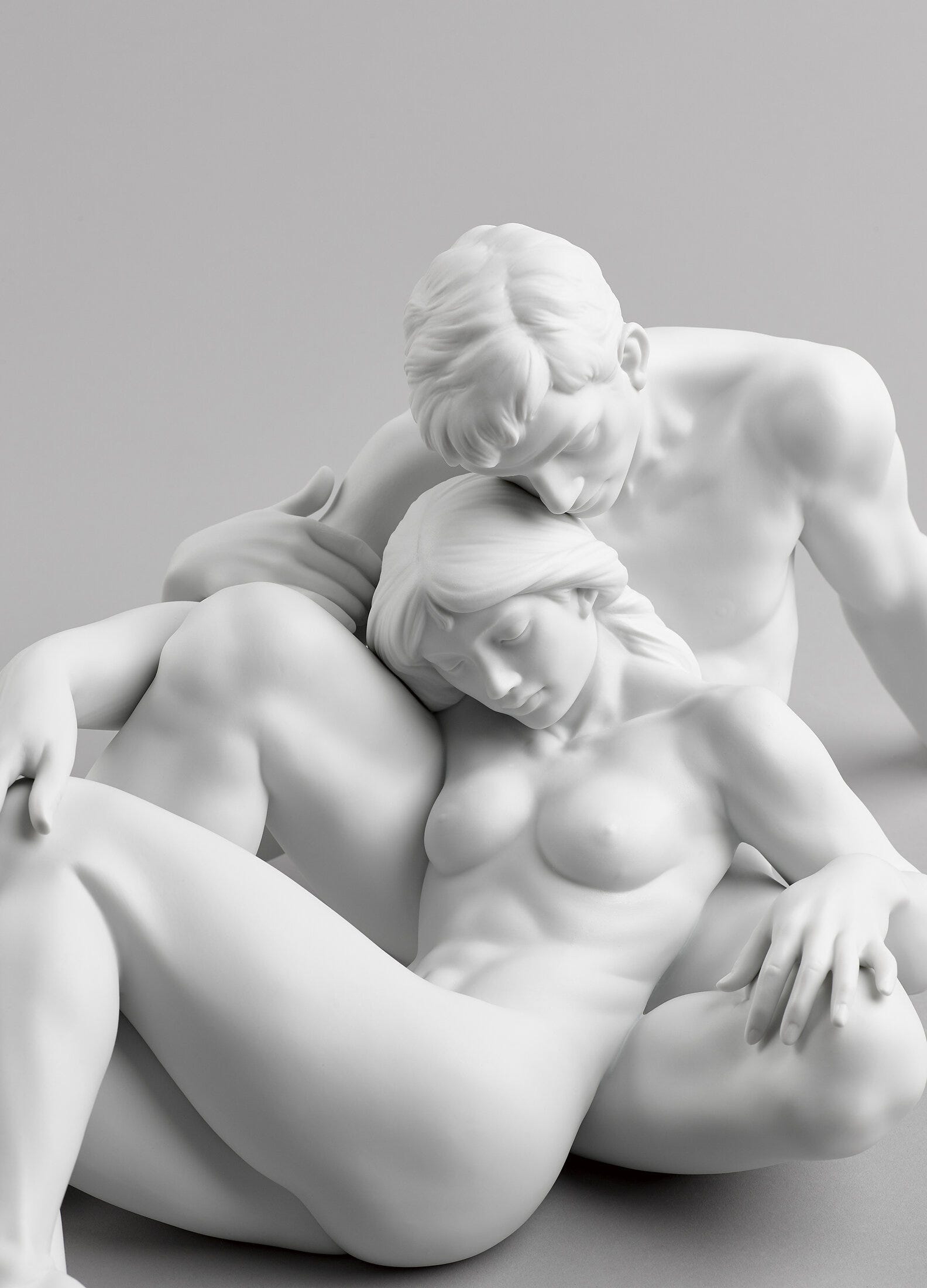 Scultura in porcellana bianca opaca di una coppia in cui l'anatomia è mostrata in dettaglio, dai muscoli dell'uomo alle piccole vene che appaiono nelle sue mani come conseguenza della postura. Altezza: 27 cm; Lunghezza: 63 cm; Profondita: 33 cm