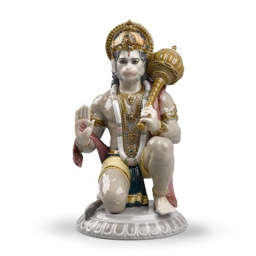 Figura del dio Mono in porcellana lucida decorata con smalti e colori che rendono omaggio alla ricca iconografia indù. Altezza: 27 cm; Lunghezza: 15 cm; Profondita: 15 cm