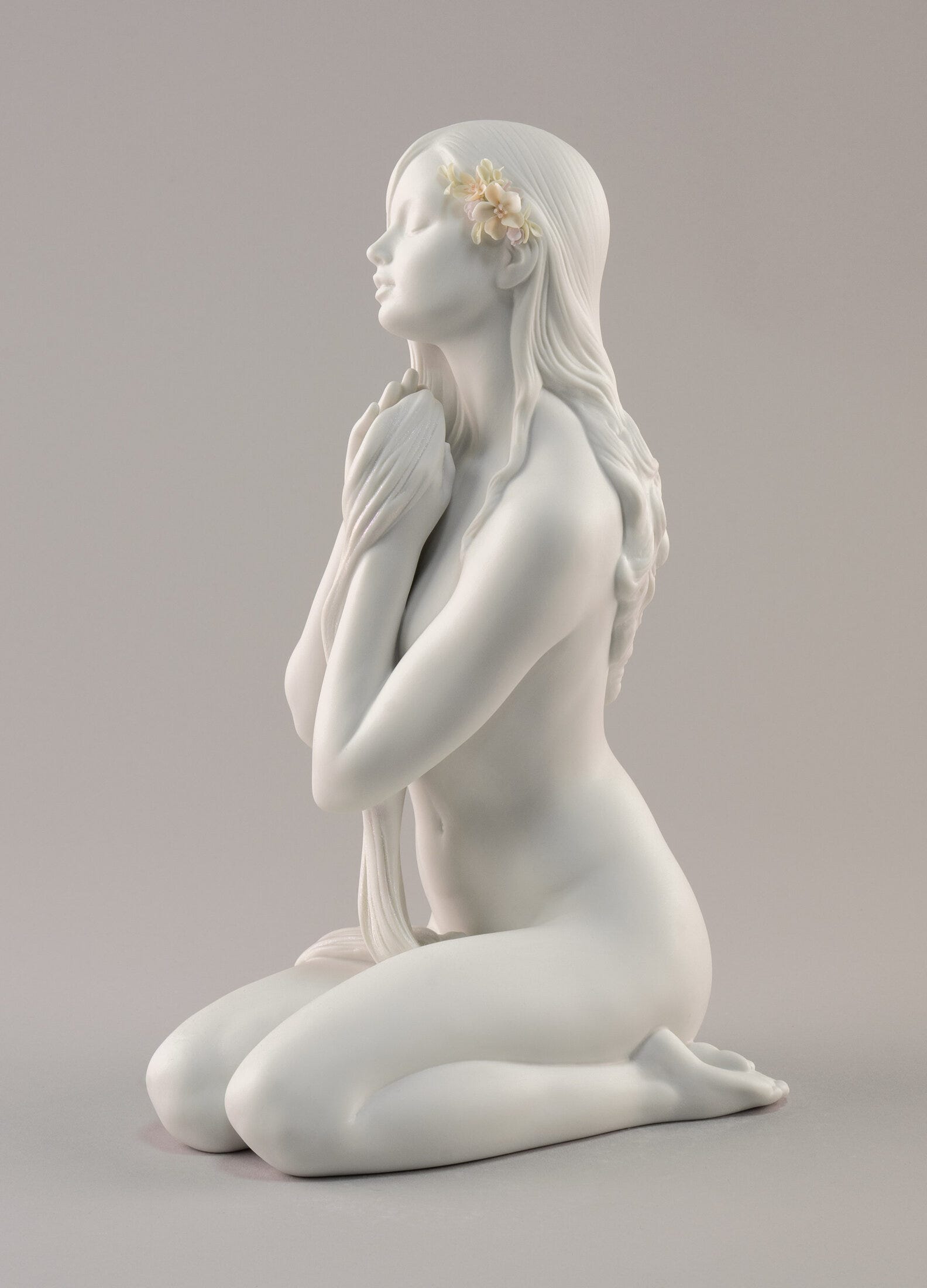 Scultura ispirata alla bellezza dell'universo femminile, per la quale gli artisti Lladró hanno scelto la porcellana bianca opaca. Un materiale che esalta l'espressività delle forme. Altezza: 31 cm; Lunghezza: 13 cm; Profondita: 19 cm