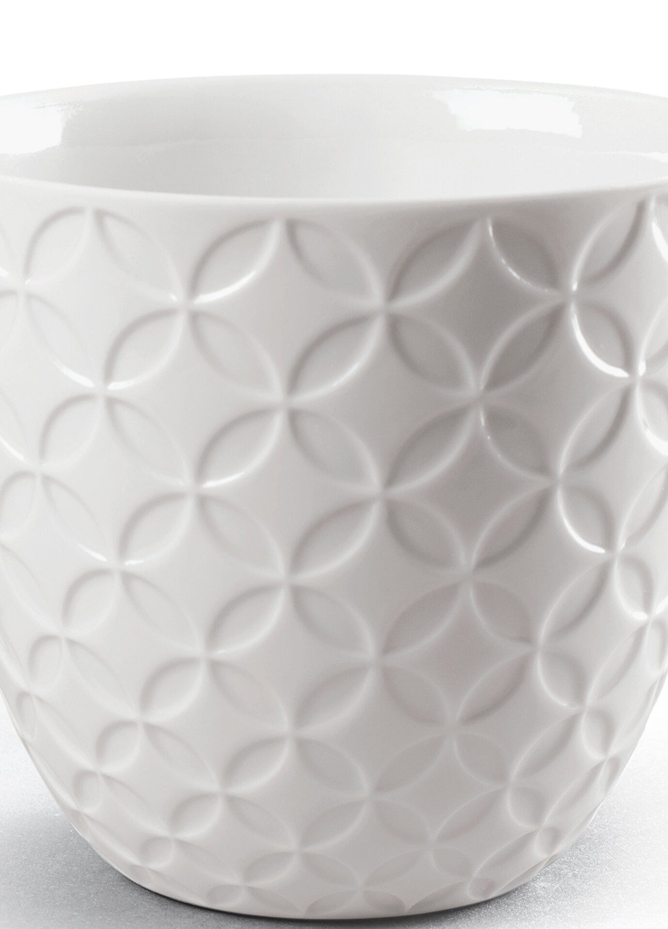 Coppia di tazzine in porcellana bianca lucida, della collezione Hitoiki, con disegni a forma di rombi e cerchi Altezza: 8 cm; Lunghezza: 18 cm; Profondita: 9 cm