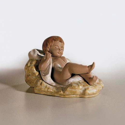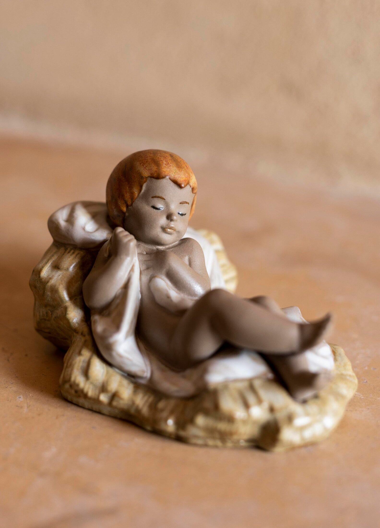 Figura in porcellana gres di Gesù sdraiato decorato con toni color ocra. Altezza: 6 cm; Lunghezza: 9 cm; Profondita: 6 cm