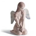Figura in porcellana opaca di donna nuda seduta con postura timida e tocchi di blu tenue sulle ali. Altezza: 20 cm; Lunghezza: 14 cm; Profondita: 18 cm