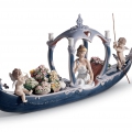Scultura in porcellana serie limitata di una dea in una gondola piena di fiori accompagnata da due angeli uno con l'arco e un altro remante con un bastone di legno. Altezza: 34 cm; Lunghezza: 74 cm; Profondita: 16 cm